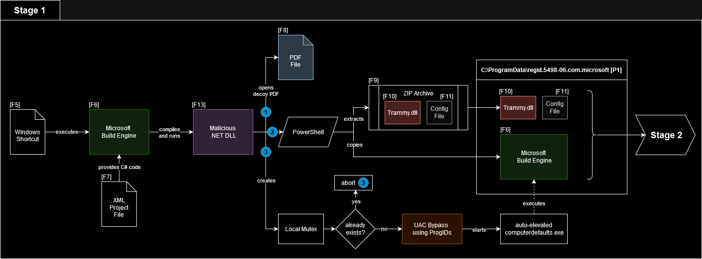 This time, however, MSBuild.exe[F6] does not compile C# code again but runs another DLL, Trammy.dll[F10], based on project configuration file[F11]. Both are extracted from the previously mentioned ZIP archive[F9]. To prevent consecutive execution of the UAC bypass, it creates a local mutex called TiiSbtvhvbCMW.