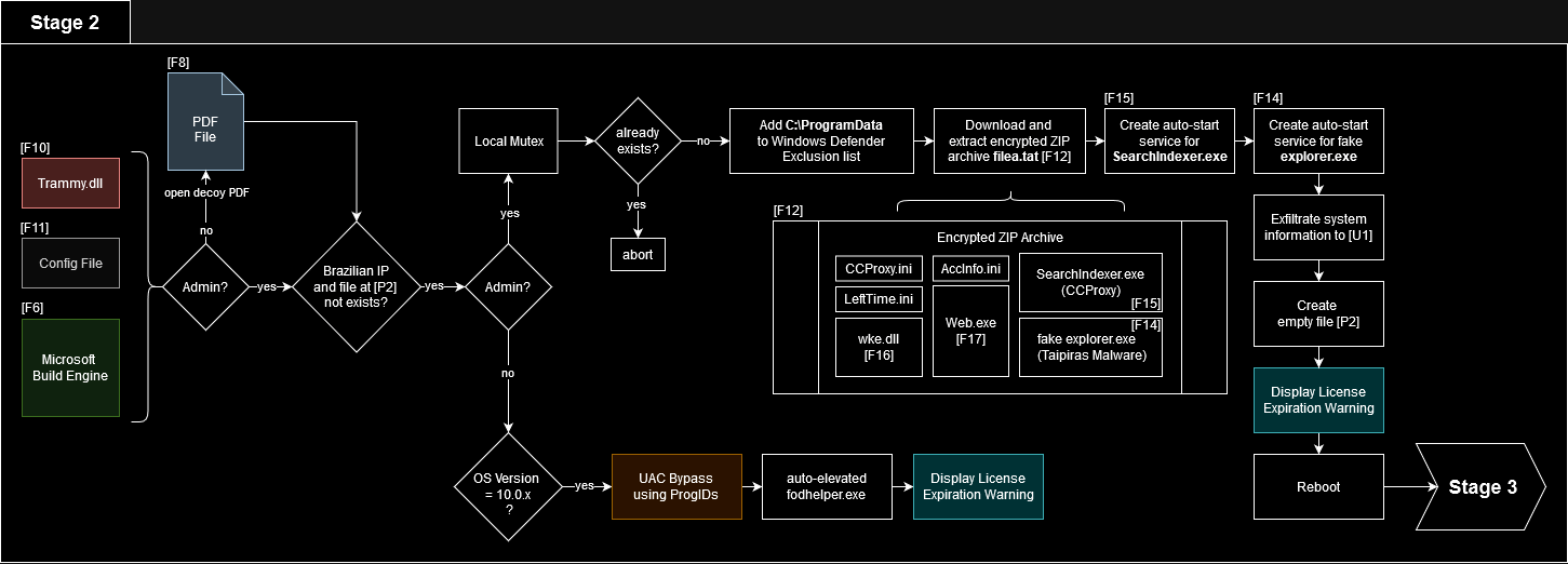 First, the freshly compiled .NET DLL[F13] opens the decoy PDF[F8] which displays a DANFE invoice to the target user. Afterwards, it extracts the ZIP archive[F9] and copies the Microsoft Build Engine[F6] to C:\ProgramData\regid.5498-06.com.microsoft[P1] via PowerShell. Finally, it leverages a UAC bypass using ProgIDs together with the auto-elevated system binary computerdefaults.exe to run the Microsoft Build Engine[F6] once again.