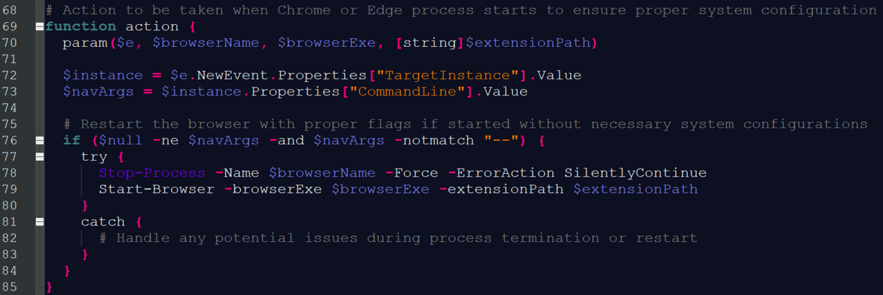 One of the PowerShell scripts, named configuration.ps1[5], monitors WMI events to listen for chrome.exe and edge.exe process starts.